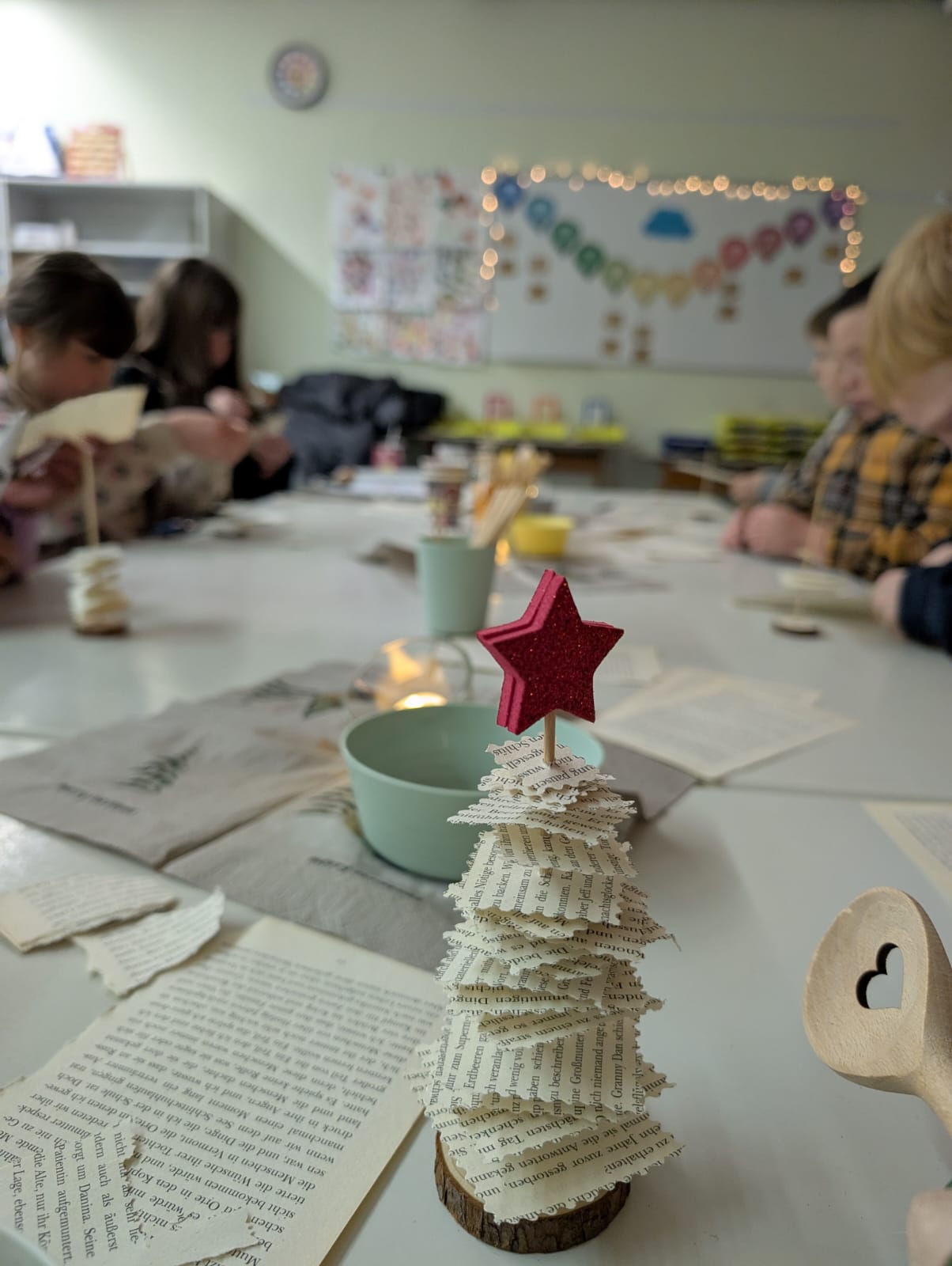 – kleine Deko-Weihnachtsbäume aus alten Buchseiten herstellen