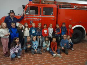 Das erste Ziel war das Feuerwehrmuseum von Georg Höhler. Dort staunten die Kinder über Feuerwehrfahrzeuge, die zum Teil über 100 Jahre alt sind. Ein besonderes Highlight: Die Schülerinnen und Schüler durften selbst einen alten Wasserschlauch ausprobieren – das machte richtig Spaß!