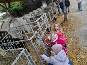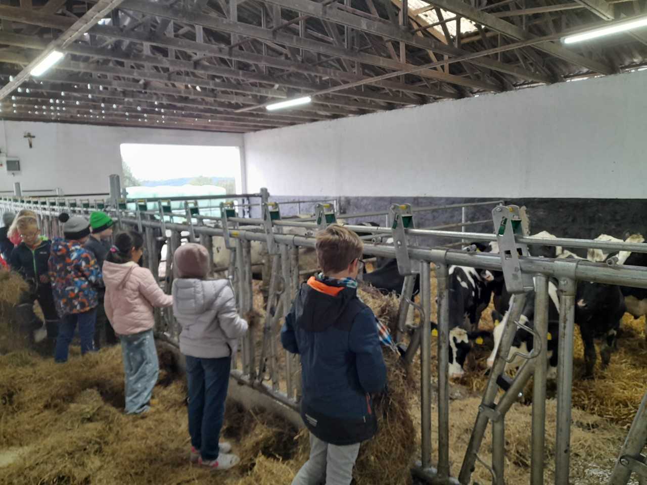Gestärkt mit einem Frühstück auf dem Spielplatz und einer fröhlichen Spielpause führte der Weg weiter zum örtlichen Bauernhof. Dort begrüßte Jannik Schick die Drachenklasse und zeigte ihnen das Hofleben. Die Kinder lernten die Ziegen Manni und Lolla kennen, fütterten Kühe und Hühner und durften sogar kleine Kälbchen streicheln. Auch die großen Maschinen beeindruckten: Ein Mähdrescher und gleich fünf Traktoren wurden neugierig bestaunt. Zum Abschluss meisterten die Kinder noch ein spannendes Hofquiz in mehreren Gruppen.