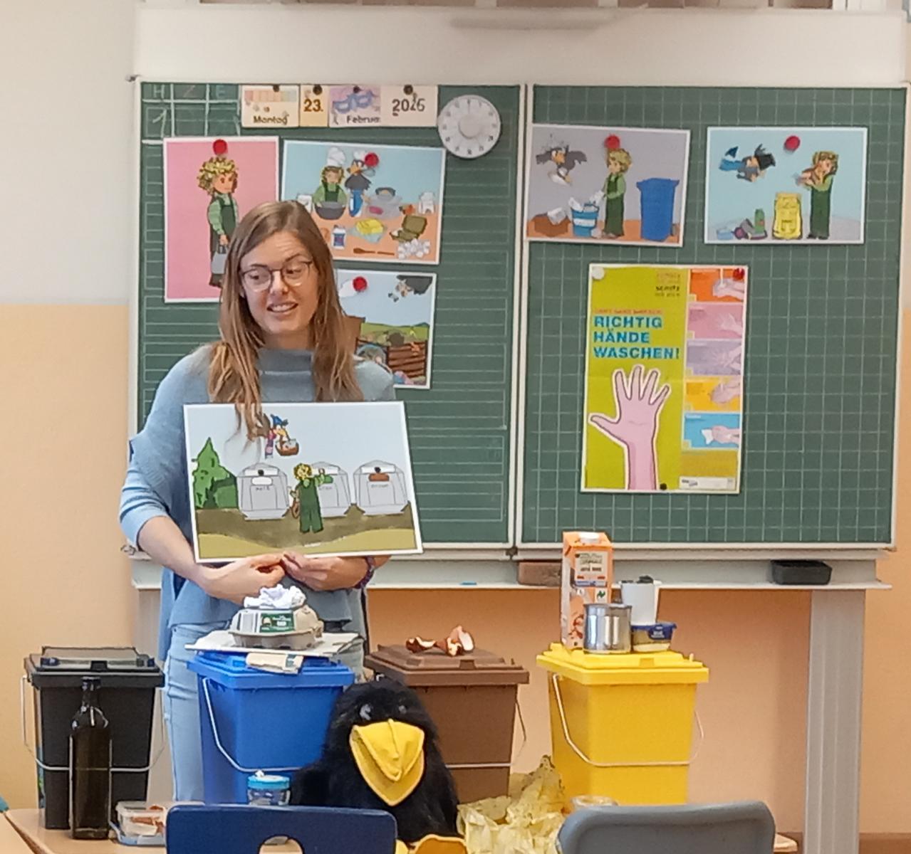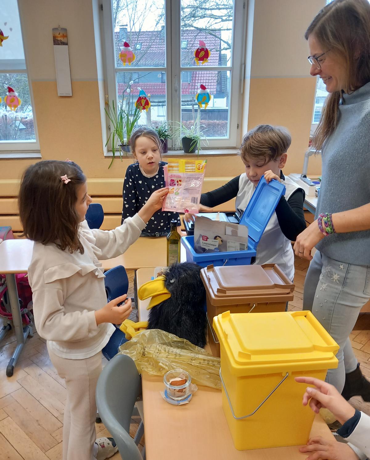 Richtig spannend und kein bisschen eklig! So erlebte die Klasse 1 aus Hausen den Besuch von Frau Rossbach, Mitarbeiterin beim Klimaschutzmanagement unseres Landkreises, obwohl es um das Thema „Müll“ ging. Zusammen mit der Rabenfrau Carla lernten die Jungen und Mädchen, dass nach dem Kuchenbacken einiges an Müll übrigbleibt. Wohin mit den Mandarinendosen, Milchtüten, Eierschachteln und Orangenschalen?