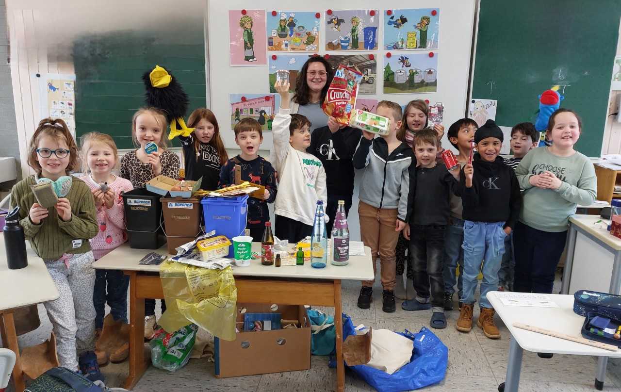 Gemeinsam überlegten die Kinder, wohin der Müll gehört. In welche Tonne kommen Plastikverpackungen? Was passiert mit Papier? Und wohin mit dem Biomüll? Schnell wurde klar: Müll ist nicht gleich Müll! Auch zu Hause und in der Schule fällt täglich Abfall an – aber wenn man richtig trennt, kann vieles wiederverwertet werden. Die Schüler erfuhren, dass aus altem Material tatsächlich Neues entstehen kann – zum Beispiel neue Verpackungen oder sogar Kleidung.