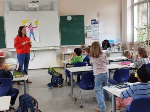 Heute bekamen die Schüler der Klasse 1 an der Grundschule in Lahr Besuch von der Gesundheitsförderin Frau Hering. Im Rahmen des Programms Klasse 2000 – „Forschen mit Klaro“, dem Unterrichtsprogramm zur Gesundheitsförderung, erklärte sie den Kindern anschaulich den Zusammenhang zwischen Atmung und Bewegung. Gemeinsam entdeckten die Schüler, welchen Weg die Luft durch unseren Körper nimmt und warum richtiges Atmen so wichtig ist.