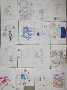 Nachdem im Deutschunterricht die „Blaue Maschine“ im tiefen Wald auftauchte und die Tiere aufgrund von unterschiedliche Besitzansprüche und Funktionsweisen („Fuchschwanzstreichelmaschine“, „Biberzahnputzmaschine“, …) darüber in Streit gerieten, der „Agent OO- Osterhase“ mit seinem „Osterhasentarnanzug nebst Würstchenwurfrakete und Farbexplosionsgerät“ das Osterfest rettete und Jonas gemeinsam mit Professor Turbozahn eine „Sockensuchmaschine“ konstruierte, mussten die letzten Kunststunden natürlich für verrückte Entwurfsskizzen, verschiedene Entwicklungsideen und den anschließenden Maschinenbau genutzt werden.
