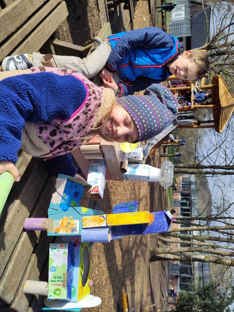 Nach der Sammlung von zahlreichen Ideen („Wellensittichfutterapparat“, „Pokemonkartenmagnet“, „Disco-Waffel-Maschine“, „Magnetsockenanzuggerätantennenautomatprozessor“😉) sowie nach einigen gelungenen Skizzen, legten die kleinen Erfinder mit großem Einfallsreichtum und riesengroßem Tatendrang im Team oder im Alleingang mit dem Entwicklungsprozess der abgefahrensten „Waldbrunner-Erfindungen“ los. Stundenlang (auch in den Regenpausen…) wurde nun intensiv gewerkelt, sich lautstark beraten, wieder alles verworfen, neue Lösungen gesucht, andere Bauteile mitgeschleppt und schließlich final geklebt, gebastelt und bemalt.