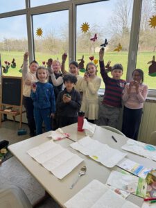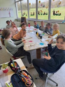 Die Kinder tauchten die gekochten Eier in Gläser mit verschiedenen Farben. Nach kurzer Einwirkzeit nahmen sie die Eier vorsichtig heraus und gestalteten sie kreativ. Mit viel Fantasie entstanden kleine Kunstwerke: Einige Eier bekamen lustige Gesichter, andere wurden mit Stickern verziert. Die Kinder schrieben auch liebevolle Botschaften auf die Eier – so durfte sich manche Mama über ein Ei mit der Aufschrift „I love you mum“ freuen.